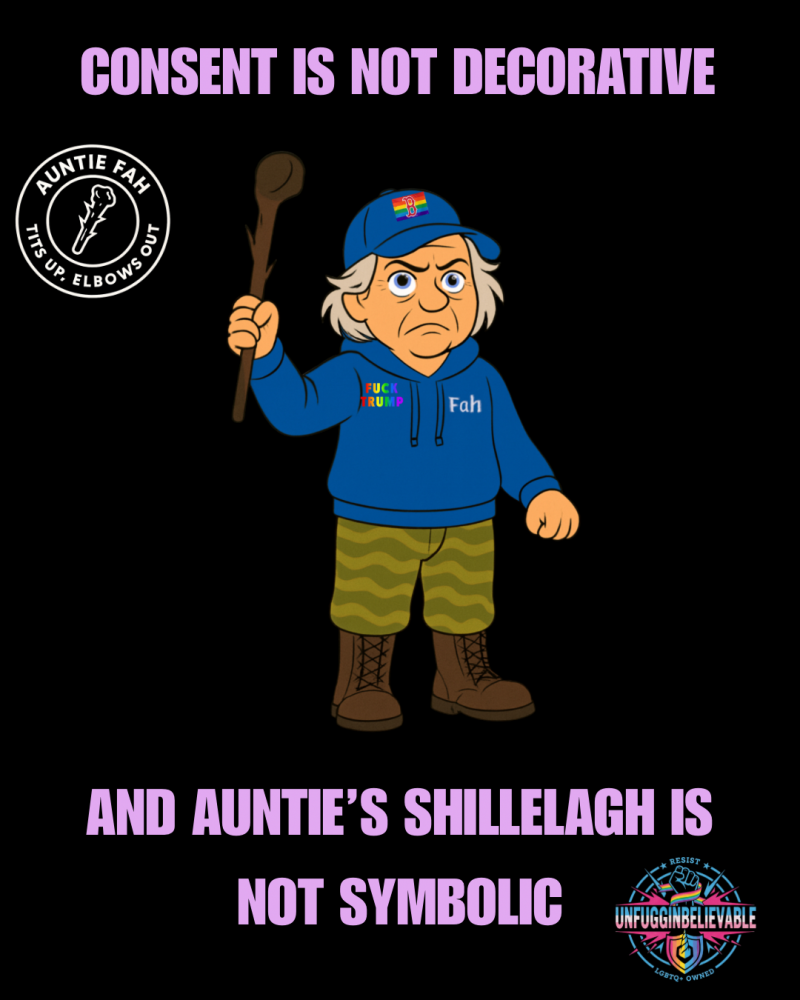 So here is what Auntie needs you to hold, underneath all of it: the fact that this makes you furious and frightened is not a sign that you’re broken. It’s a sign that you’re calibrated correctly. You are reading the situation accurately. The appropriate response to watching someone explain that consent is optional is rage. Grief. The particular sick feeling of recognition that comes from having heard that logic before and knowing exactly where it leads.